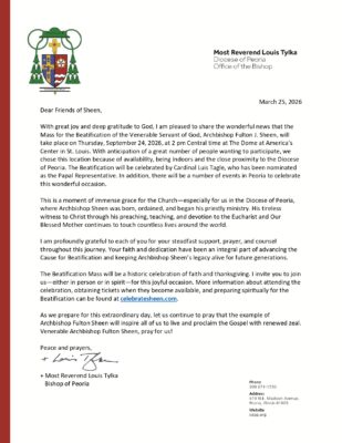s velikou radostí a hlubokou vděčností Bohu s vámi sdílím úžasnou novinu, že ve čtvrtek 24. září 2026 ve 14 hodin (Central time) proběhne v zařízení The Dome at America’s Center v St. Luis blahořečení ctihodného služebníka Božího arcibiskupa Fultona J. Sheena. Vybrali jsme toto místo vzhledem k tomu, že očekáváme velkou účast a toto místo je dostupné, pojme velké množství lidí a je blízko diecézi Peoria. Blahořečení bude předsedat kardinál Luis Tagle, papežský delegát. Na oslavu beatifikace se v Peorii chystá mnoho akcí.