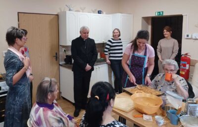 První zastávka byla v Domě klidného stáří Pravětín. Ředitelka Dana Marková představila hostům historii Charity i současnou rozsáhlou činnost. Jednotlivé služby Charity zajišťuje téměř 120 zaměstnanců, obrat Charity je přes 80 milionů. Pan biskup si prohlédl celé zařízení, setkal se se zaměstnanci i s klienty, zajímal se nejen o financování jednotlivých činností, ale i o technické zázemí domova (provoz kuchyně, vytápění budov) apod.