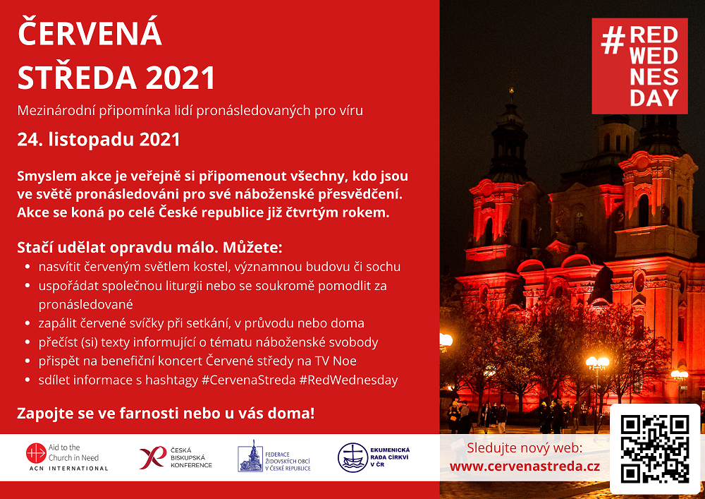 Letos proběhne již čtvrtý ročník iniciativy Červená středa, která má za cíl podpořit vzájemnou náboženskou toleranci ve společnosti a vyjádřit solidaritu s těmi, kteří jsou kvůli své víře pronásledováni nebo utlačováni. Česká biskupská konference pořádá u příležitosti Červené středy benefiční koncert, jehož výtěžek půjde na podporu křesťanů v iráckém Mosulu. Koncert proběhne 24. listopadu 2021 v Praze, přenášet ho bude TV Noe. Darovat bude možné i z pohodlí domova.