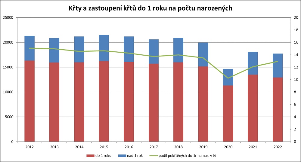 Křty dětí do jednoho roku na celkovém počtu pokřtěných přitom v posledních dvou letech klesly. Do roku 2020 představovaly vždy více než ¾ ze všech křtů, loni klesly pod 73 %. Tento pokles je kompenzován nárůstem pokřtěných v kategorii 1-7 let ze 14 na 18 %. Což v roce 2021 jistě souviselo s odkládáním křtů dětí narozených během největších restrikcí, nicméně tento trend zůstal zachován i v loňském roce, a to v Čechách i na Moravě.