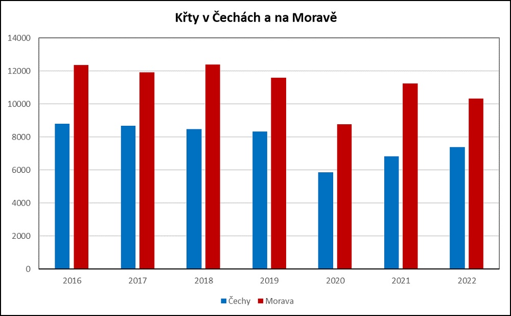 Tradičně zbožnější Morava se podílí na křtech v České republice téměř ze 3/5. Během let lockdownů a omezení se tento podíl ještě zvýšil, na 62,2 % v roce 2021. V loňském roce však všechny diecéze české církevní provincie vykazovaly vyšší počty pokřtěných než v předchozích dvou letech a poměr křtů mezi Čechy a Moravou se vrátil do původního stavu.