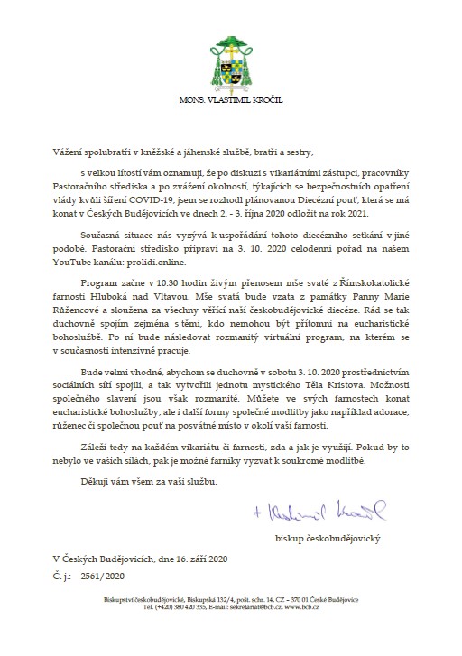 Vzhledem ke zhoršující se situaci s nemocí COVID-19 rozhodl Otec biskup Vlastimil o zrušení letošní Diecézní poutě, která se měla konat v Českých Budějovicích 2. – 3. října 2020. Naplánovaný program Diecézní poutě (tj. divadelní představení, odborné přednášky, workshop o zacházení s vodou, výstava o nedostatku vody v rozvojových zemích, edukativně-zábavný program pro děti aj.) se přesunuje na rok 2021 (termín zatím není stanoven).