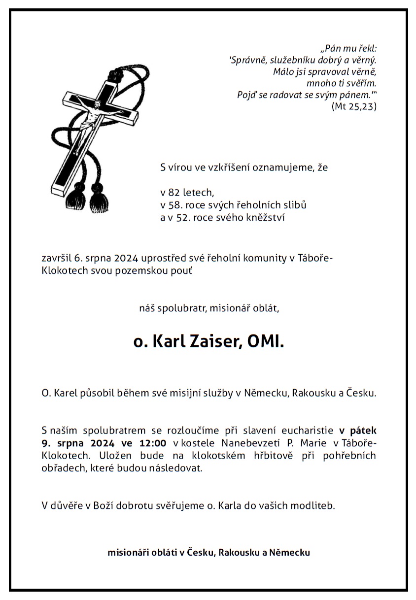 S vírou ve vzkříšení oznamujeme, že v 82 letech, v 58. roce svých řeholních slibů a v 52. roce svého kněžství završil 6. srpna 2024 uprostřed své řeholní komunity v Táboře-Klokotech svou pozemskou pouť náš spolubratr, misionář oblát, o. Karl Zaiser, OMI.