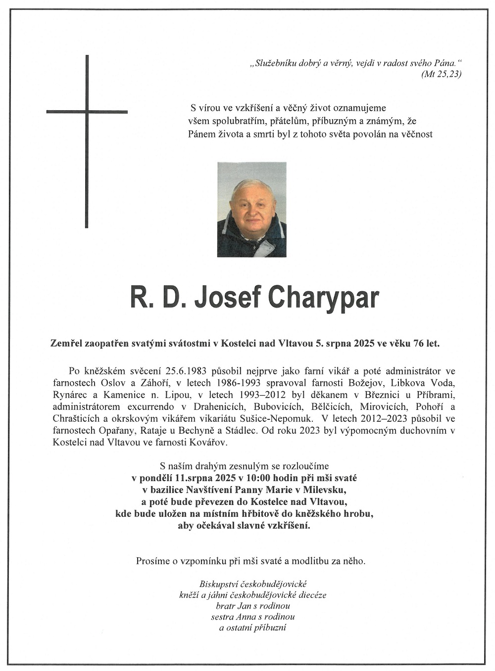 S vírou ve vzkříšení a věčný život oznamujeme všem spolubratřím, přátelům, příbuzným a známým, že Pánem života a smrti byl z toho světa povolán na věčnost R.D. Josef Charypar.