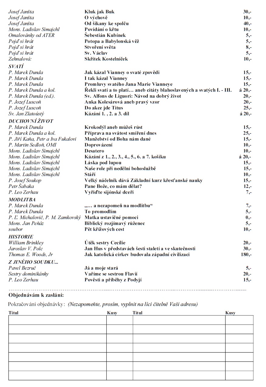 V příloze níže najdete aktuální nabídku našich tiskovin, které se mohou hodit například jako vánoční dárek či příležitostné evangelizační materiály. Mnozí už objevili, že díky minimálním pořizovacím nákladům si mohou opatřit i větší množství brožurek od jednoho titulu a pak je smysluplně šířit ve svém okolí. Kromě nabídky v příloze je u nás možno pro evangelizační účely v jakémkoliv potřebném množství objednat – i třeba zcela bezplatně – časopis Milujte se!, například pro vánoční návštěvníky kostela či jako dárek od Tříkrálových koledníků apod.