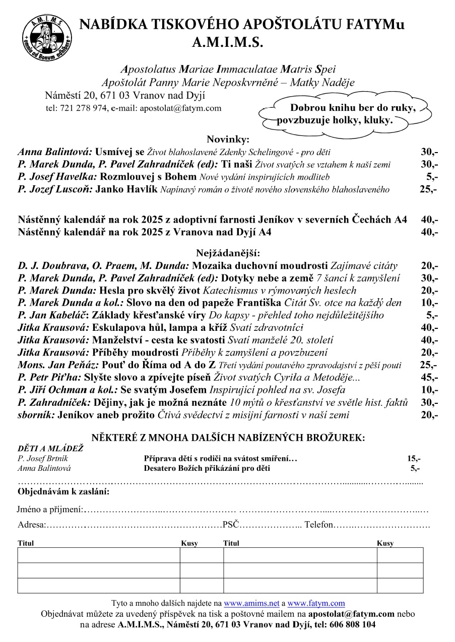 Nabízím Vám možnost využít naši nabídku tiskovin. Tiskoviny v našem vydavatelství A.M.I.M.S. tiskneme se záměrem povzbudit v dobrém, pozvat k hlubšímu prožívání víry a nenásilně informovat o křesťanských hodnotách. Šíříme je pouze za doporučený příspěvek na tisk a poštovné. Vycházejí s církevním schválením biskupství brněnského.