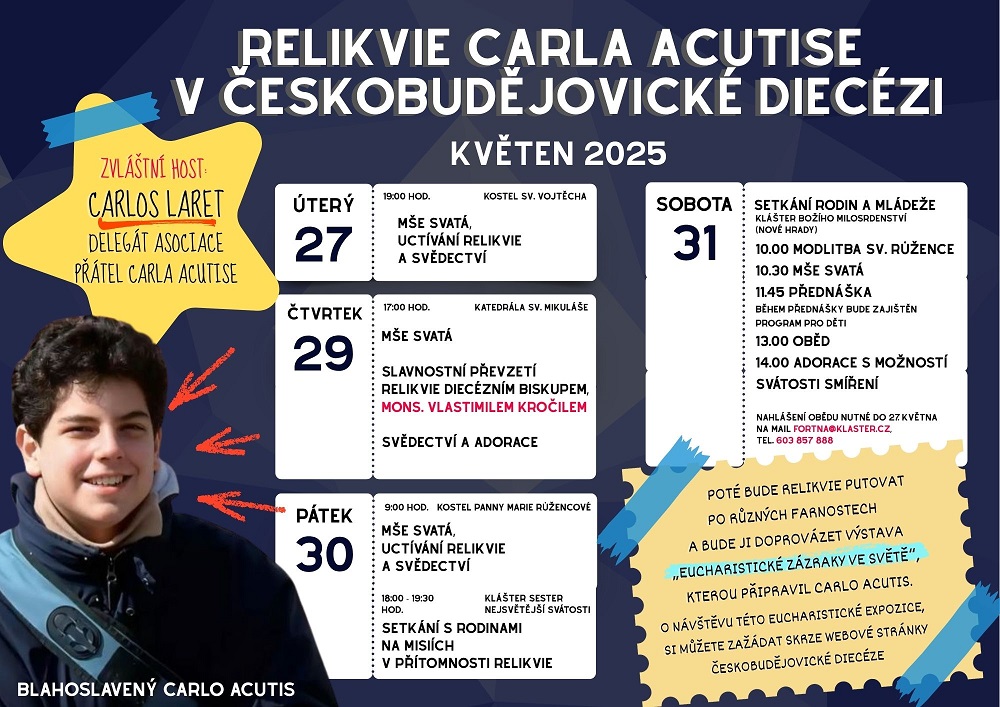 Srdečně zveme na mše svaté a další akce, které připravujeme v souvislosti se získáním relikvie bl. Carla Acutise do naší diecéze. Program najdete na plakátu níže.