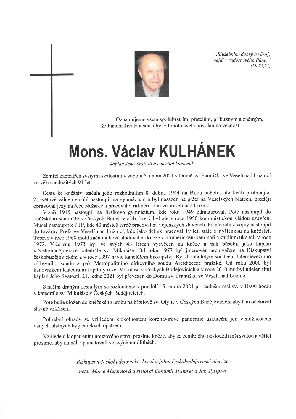 V sobotu 6. února 2021 zemřel ve věku nedožitých 91 let Mons. Václav Kulhánek, kaplan Jeho Svatosti, dlouholetý diecézní archivář, kancléř a emeritní kanovník Katedrální kapituly u sv. Mikuláše. Kněžskou službu vykonával v Českých Budějovicích od roku 1973 téměř do posledních chvil života – tedy neuvěřitelných 47 let.