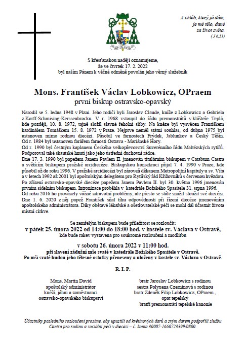 V sobotu 26. února přinese od 11:00 hodin zádušní mši svatou z katedrály Božského Spasitele v Ostravě s následným přenesením a uložením ostatků v kostele sv. Václava v Ostravě. Již od 10:00 hodin a také po slavení mše svaté bude možné sledovat rovněž speciální studio Děkujeme, otče biskupe – Vzpomínky na biskupa Františka Václava Lobkowicze O. Praem.
