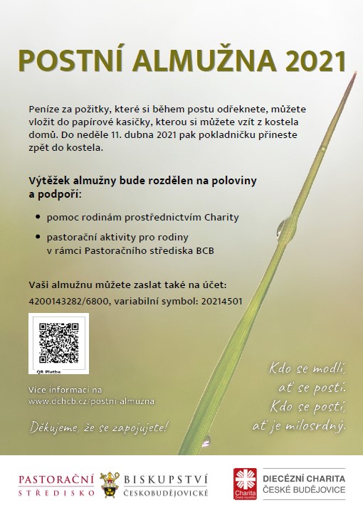 Postní almužna v českobudějovické diecézi je společným projektem diecézní Charity České Budějovice a Pastoračního střediska Biskupství českobudějovického. Jedná se o příležitost, jak věnovat svoje postní snažení ve prospěch potřebných.
