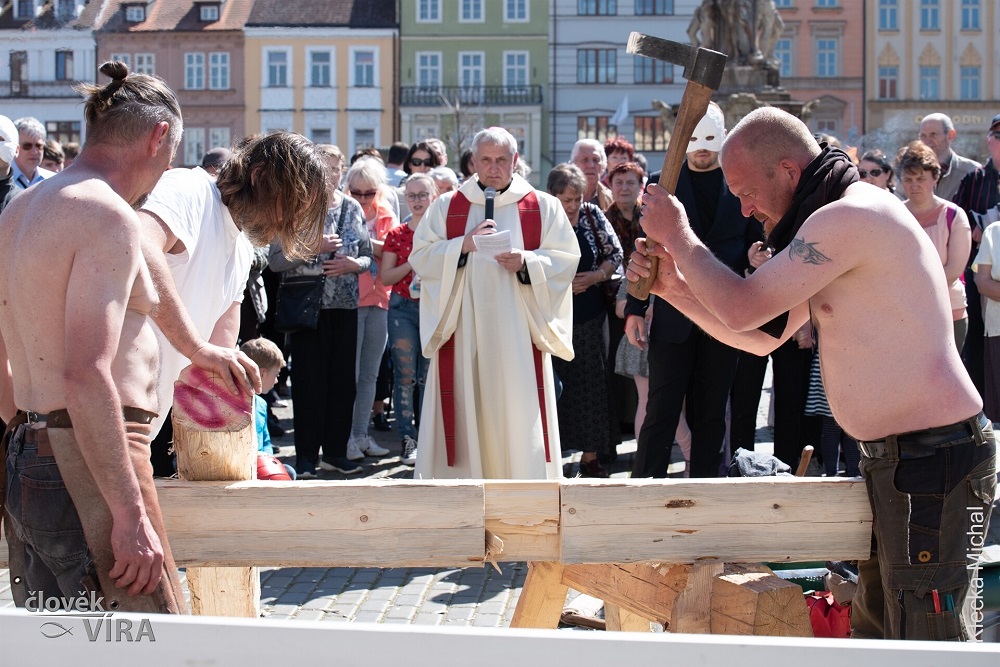 Postavení křížové cesty bude na Velký pátek od 6:00 do 12:00 předcházet tesání dřevěných křížů přímo na náměstí.