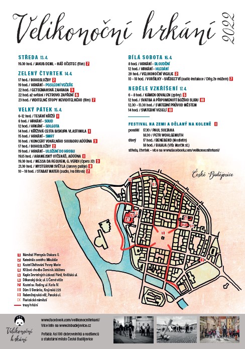 Velikonoční hrkání v Českých Budějovicích organizuje divadelník Víťa Marčík již od roku 2010 a pomáhá mu v tom zhruba stovka účinkujících. Zahájení bude na Zelený čtvrtek od 17:00 bohoslužbou v katedrále sv. Mikuláše. Podrobný program a další informace najdete na odkazu https://www.budejce.cz/kalendar/115-velikonocni-hrkani