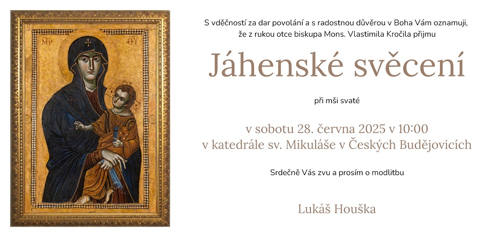 S vděčností za dar povolání a s radostnou důvěrou v Boha Vám oznamuji, že z rukou otce biskupa Mons. Vlastimila Kročila přijmu jáhenské svěcení.