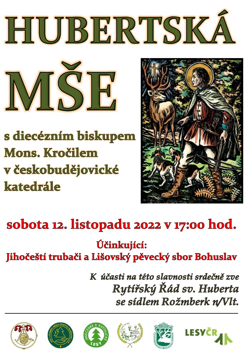 V českobudějovické katedrále sv. Mikuláše budeme slavit Hubertskou mši svatou. Celebrovat bude diecézní biskup Mons. Vlastimil Kročil. Hudební doprovod zajistí Jihočeští trubači a Lišovský pěvecký sbor Bohuslav. K účasti na této slavnosti vás srdečně zve i Rytířský řád sv. Huberta se sídlem v Rožmberku nad Vltavou.