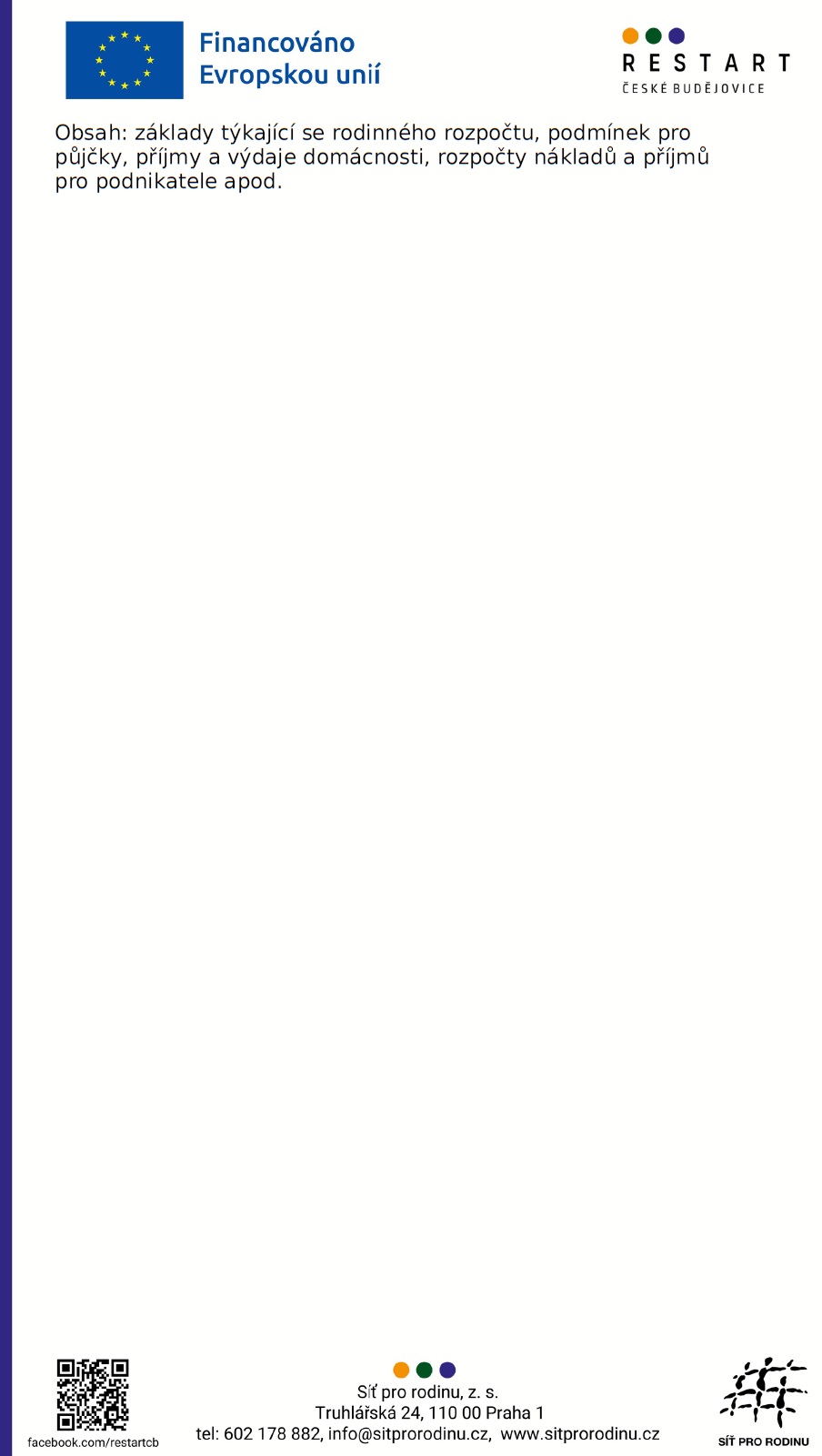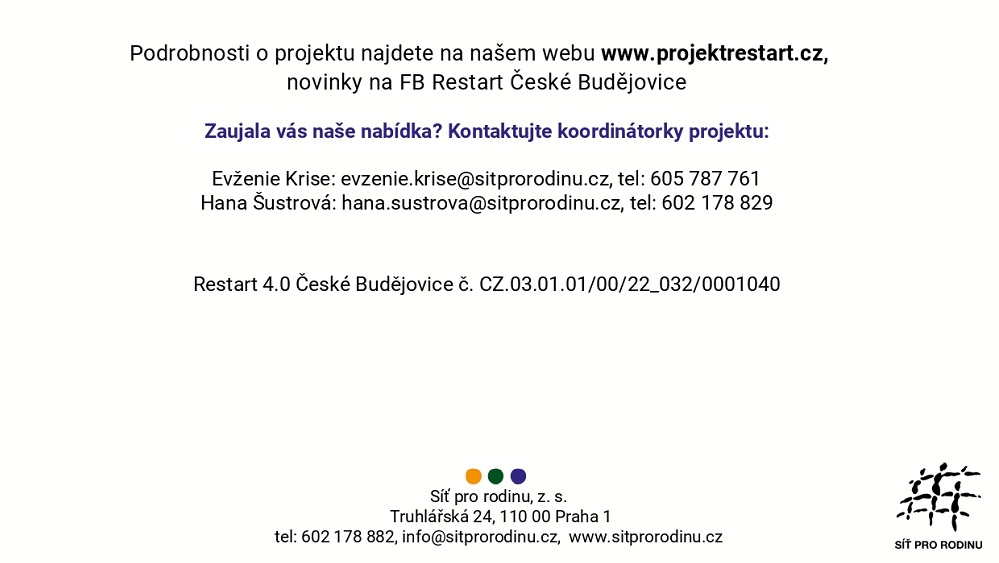rády bychom vám představily nabídku vzdělávacího kurzu Restart, který pořádá Síť pro rodinu a bude probíhat v našem Křesťanském rodinném centru Petrklíč.