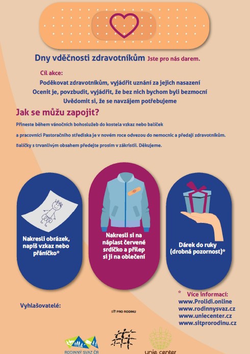 Pastorační středisko při Biskupství českobudějovickém vás všechny zve a prosí, abyste se zapojili do akce „Dny vděčnosti zdravotníkům“, kterou tento rok opět pořádáme ve spolupráci s Národním centrem pro rodinu a Rodinným svazem. Minulý rok na jaře jsme jako pilotní projekt do tří nemocnic dovezli podporu a povzbuzení formou balíčků pro zdravotníky. Čekala nás velká vděčnost. Proto budeme tuto akci opakovat a rozšiřovat, neboť zdravotníci si to zaslouží.