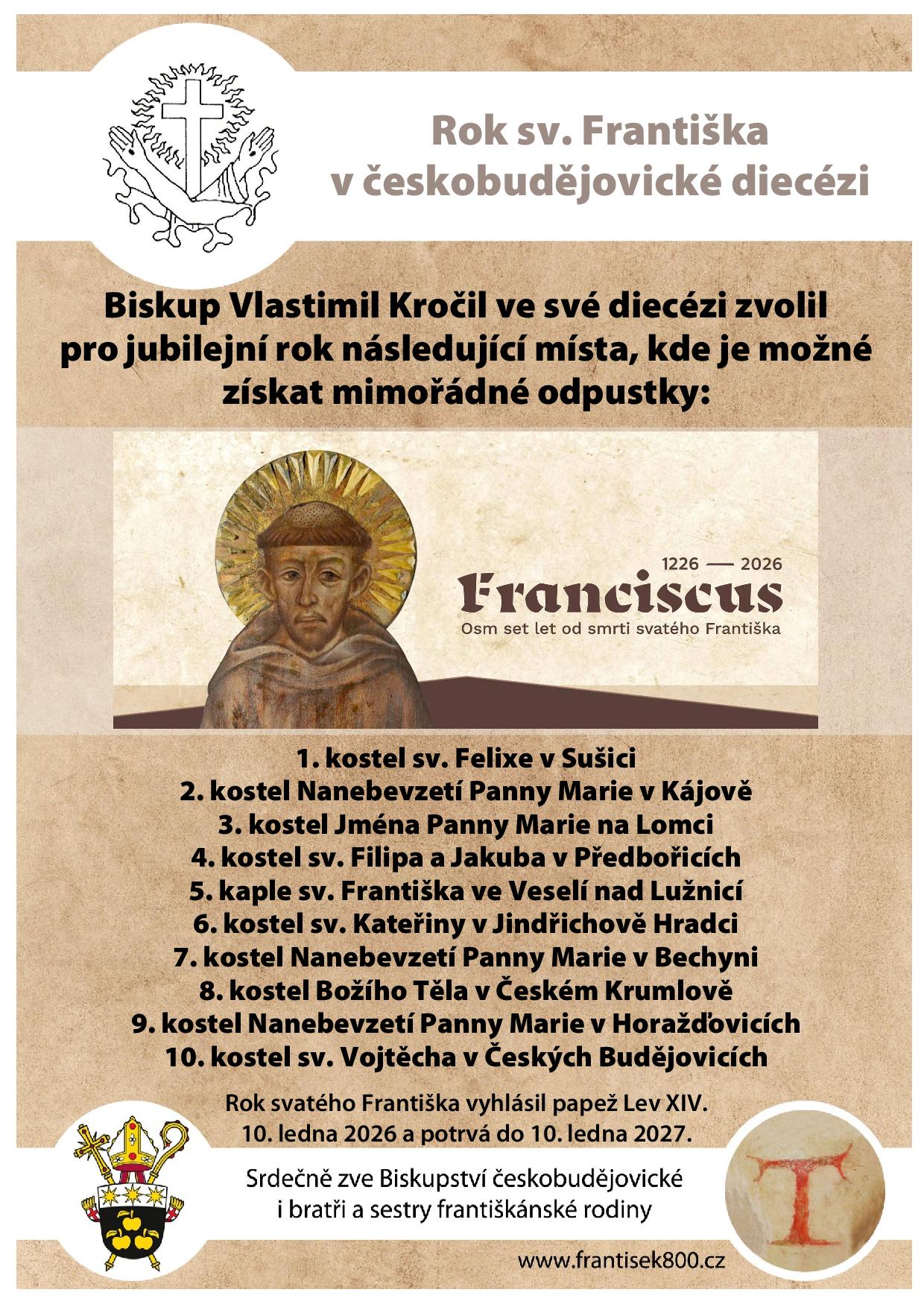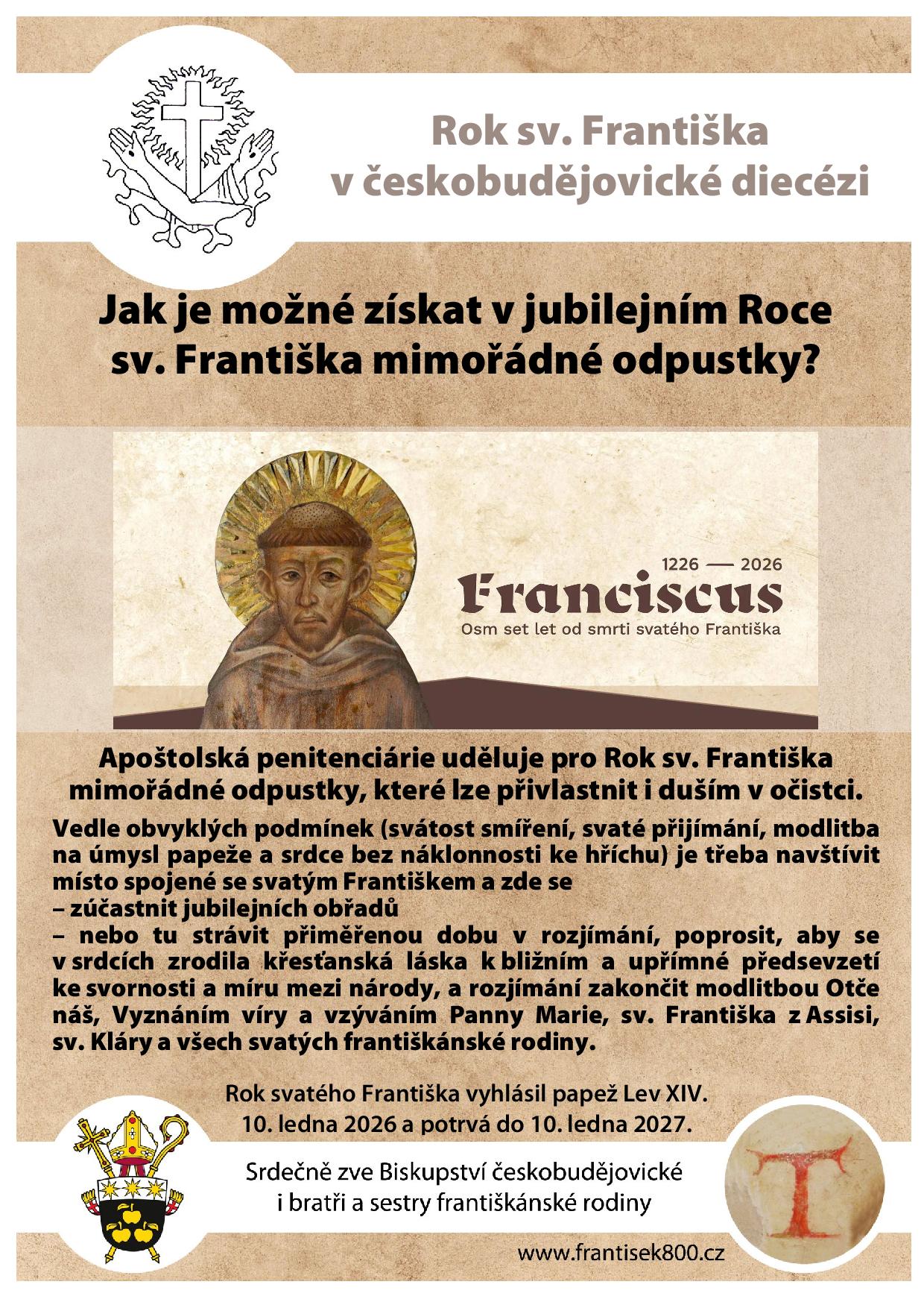 Plakátek s přehledem odpustkových míst v českobudějovické diecézi si otevřte zde a plakátek s informacemi k odpustkům zde. Místa spojená se svatým Františkem v celé České republice najdete zde.