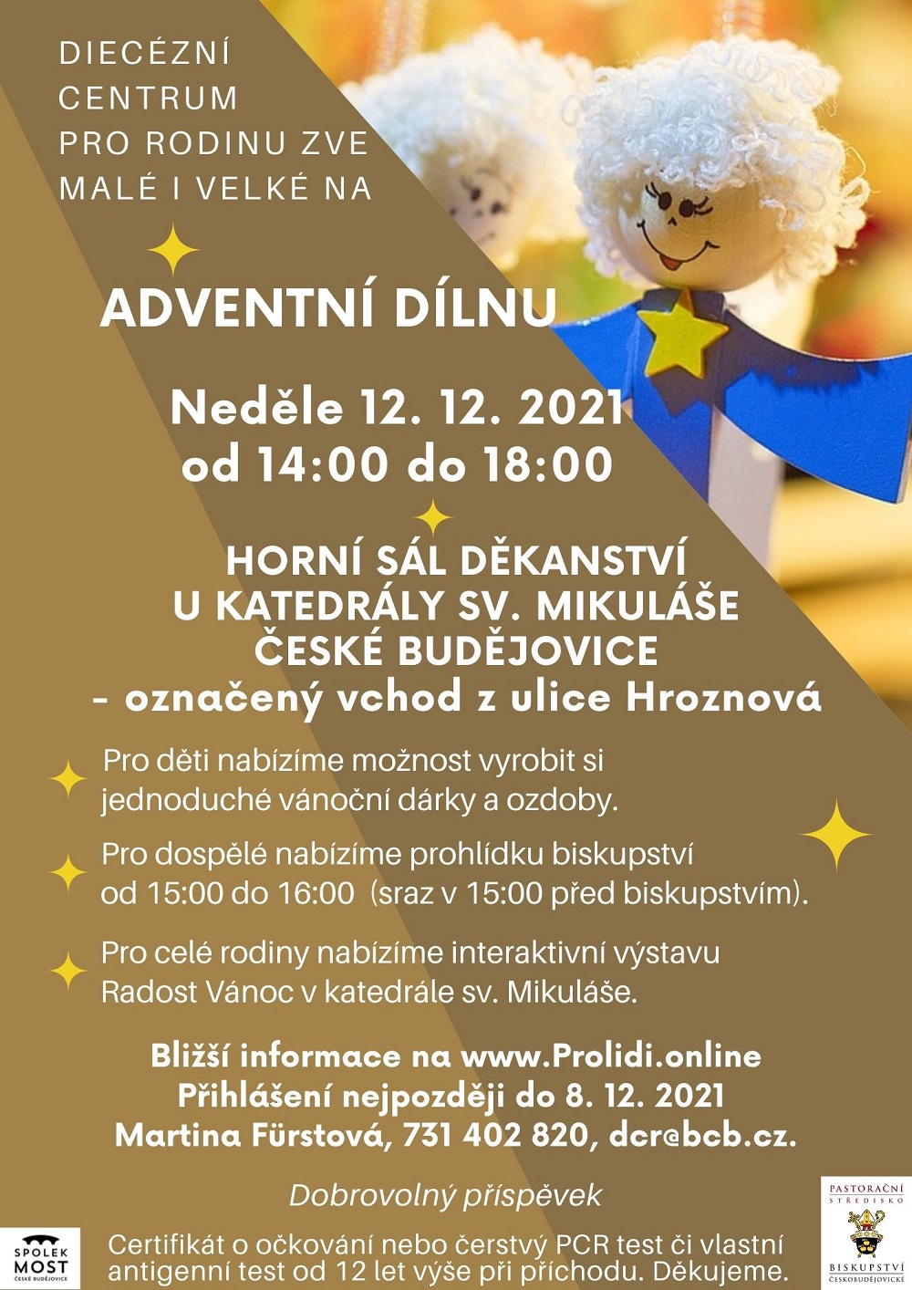 Diecézní centrum pro rodinu zve malé i velké na ADVENTNÍ DÍLNU. Bližší informace na www.Prolidi.online. Přihlášení nejpozději do 8. 12. 2021 – Martina Fürstová, tel.: 731 402 820 nebo dcr@bcb.cz.