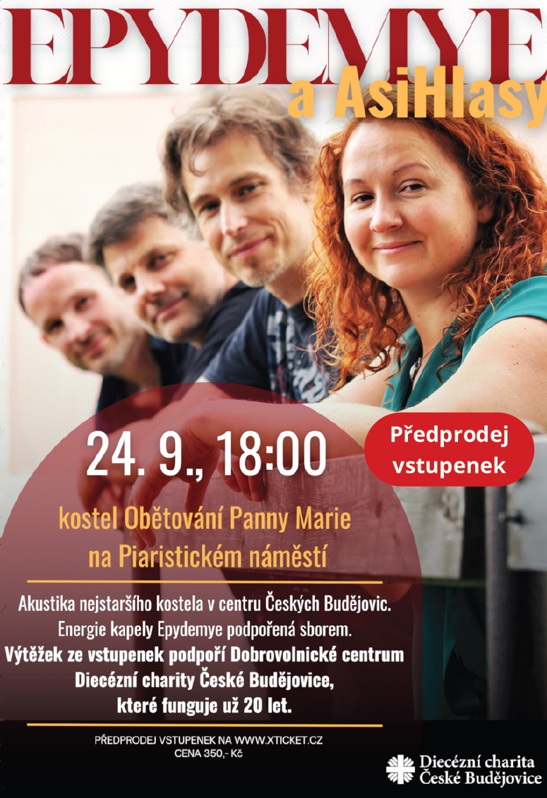 Přijďte podpořit práci Diecézní Charity s dobrovolníky a užijte si večer plný energie a skvělé hudby v podání skupiny Epydemye. Tento koncert je věnován podpoře a rozvoji dobrovolnických aktivit, které jsou neocenitelnou součástí našich charitativních projektů. Každá vstupenka pomáhá zlepšit naše služby a rozšířit pomoc tam, kde je to nejvíce potřeba.