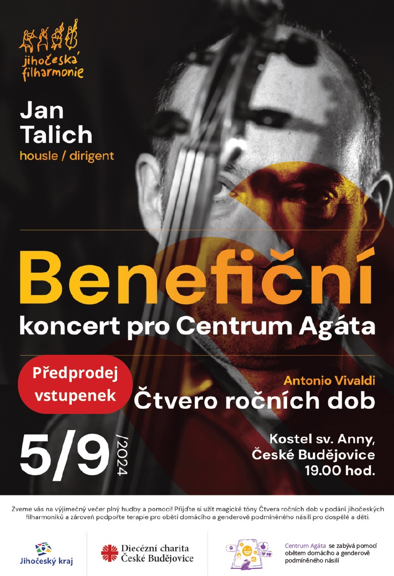 Přijďte si vychutnat magické tóny Čtvera ročních dob v podání Jihočeské filharmonie pod vedením renomovaného dirigenta Jana Talicha. Tento výjimečný koncert podpoří služby Centra Agáta, které pomáhá obětem domácího a genderově podmíněného násilí. Zakoupením vstupenky nejenže zažijete nezapomenutelný hudební večer, ale také přispějete k financování terapie a podpory pro dospělé i děti v těžkých situacích.