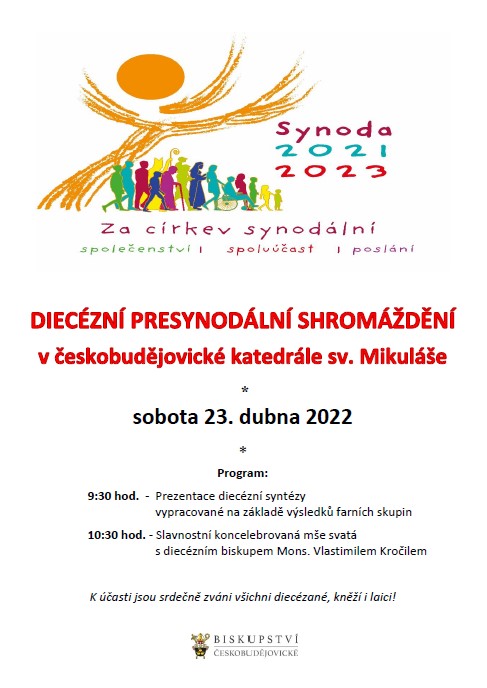 Srdečně zveme všechny diecézany, kněží i laiky, do českobudějovické katedrály sv. Mikuláše na DIECÉZNÍ PRESYNODÁLNÍ SHROMÁŽDĚNÍ. Po představení diecézní syntézy Synodální cesty, vypracované na základě výsledků farních skupinek, budeme společně slavit slavnostní koncelebrovanou mši svatou s diecézním biskupem Mons. Vlastimilem Kročilem.