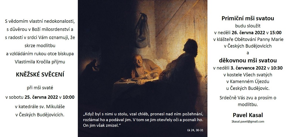 Primiční mši svatou bude novokněz Pavel Kasal sloužit v neděli 26. června 2022 v 15:00 v klášteře Obětování Panny Marie v Českých Budějovicích.