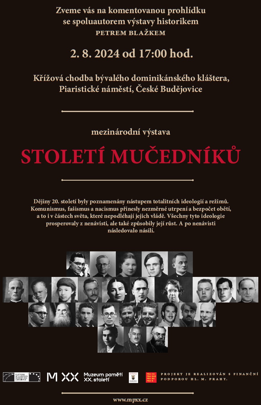 Muzeum paměti XX. století a pastorační středisko v Českých Budějovicích zve všechny na komentovanou prohlídku výstavy „Století mučedníků“, které se můžete zúčastnit 2. srpna 2024 od 17:00 v bývalém dominikánském klášteře na Piaristickém náměstí v Českých Budějovicích.