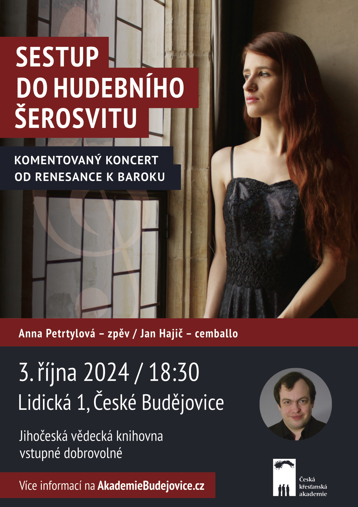 Místní skupina České křesťanské akademie v Českých Budějovicích si dovoluje srdečně vás pozvat na unikátní komentovaný koncert staré hudby. S hudebními poklady z přelomu 16. a 17. století vás seznámí Jan Hajič (cembalista, varhaník a muzikolog) a Anna Petrtylová (sopranistka a specialistka na starou hudbu). Více informací na https://www.akademiebudejovice.cz/