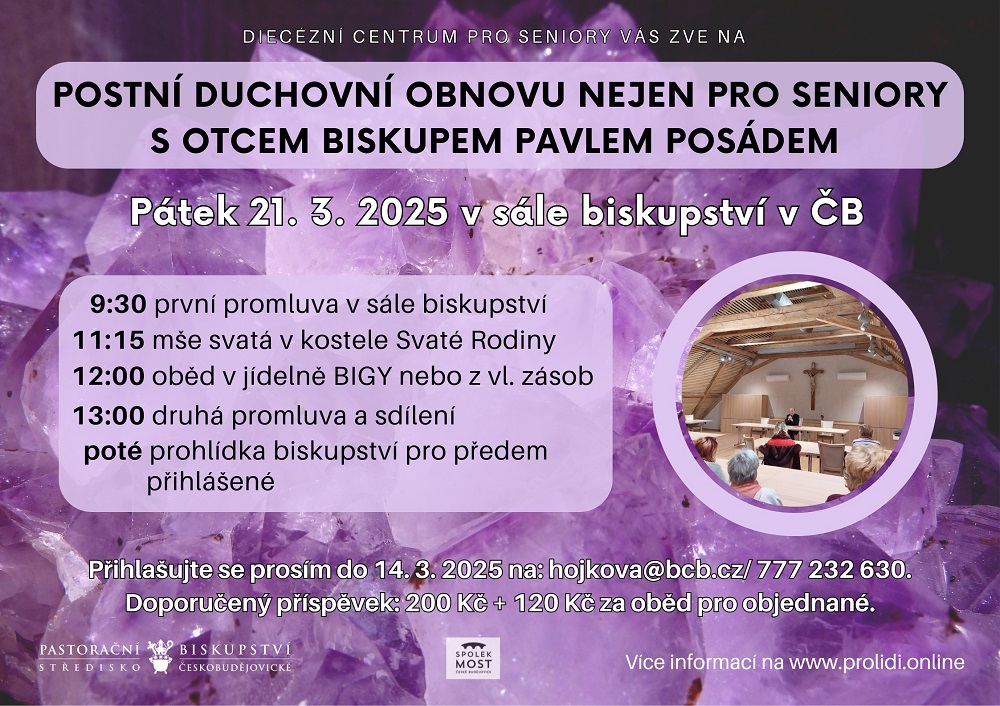 Postní duchovní obnova s biskupem Pavlem Posádem bude probíhat v pátek 21. března 2025 v konferenčním sále Biskupství českobudějovického. V 9:30 začne první promluva a v 11:15 oslavíme mši svatou v kostele Svaté rodiny. Následovat bude oběd v jídelně Biskupského gymnázia (BIGY) – pouze pro předem objednané. Odpolední program zakončí ve 13:00 druhá promluva a následně sdílení. Po ukončení obnovy bude zájemcům nabídnuta prohlídka budovy Biskupství českobudějovického. Další informace na odkazu ZDE.