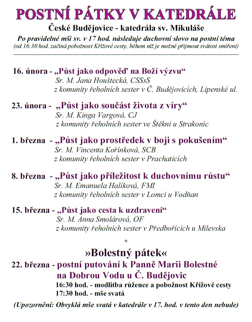 Srdečně vás zveme do katedrály sv. Mikuláše. Po celé postní období bude každý pátek po pravidelné mši svaté následovat duchovní slovo.