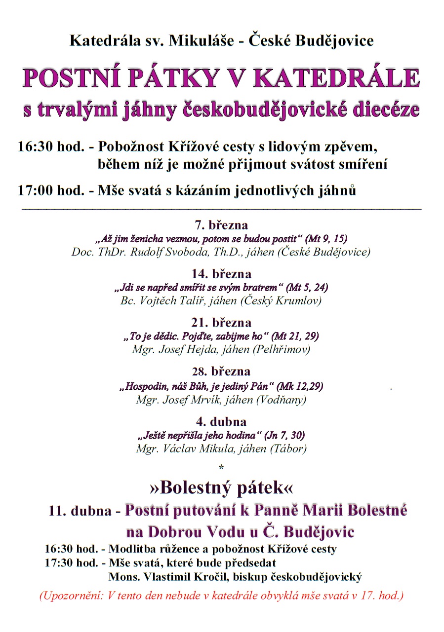 V postní době roku 2025 budou každý pátek v naší katedrále sv. Mikuláše kázat trvalí jáhni na zajímavá témata – viz plakát níže. Srdečně zveme!