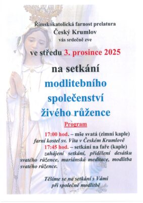 Č. KRUMLOV: Modlitební setkání Živého růžence Události v diecézi Datum od: 3.12.2025 17:00 Datum do: 3.12.2025 19:00 Místo: Kostel sv. Víta a fara Český Krumlov Facebook Twitter