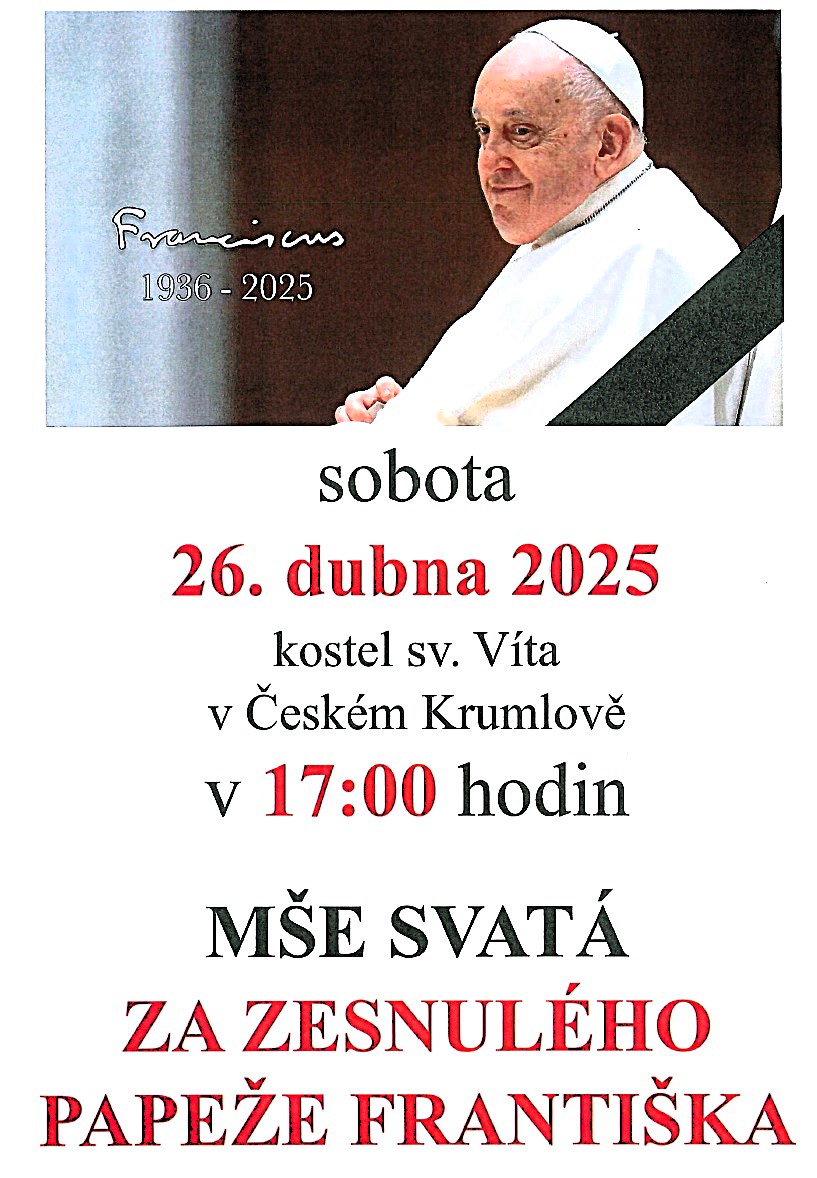 Zároveň si Vás dovoluji pozvat v sobotu 26. dubna 2025 do kostela sv. Víta v Českém Krumlově, kde se od 17:00 hodin uskuteční mše svatá za zesnulého papeže Františka.