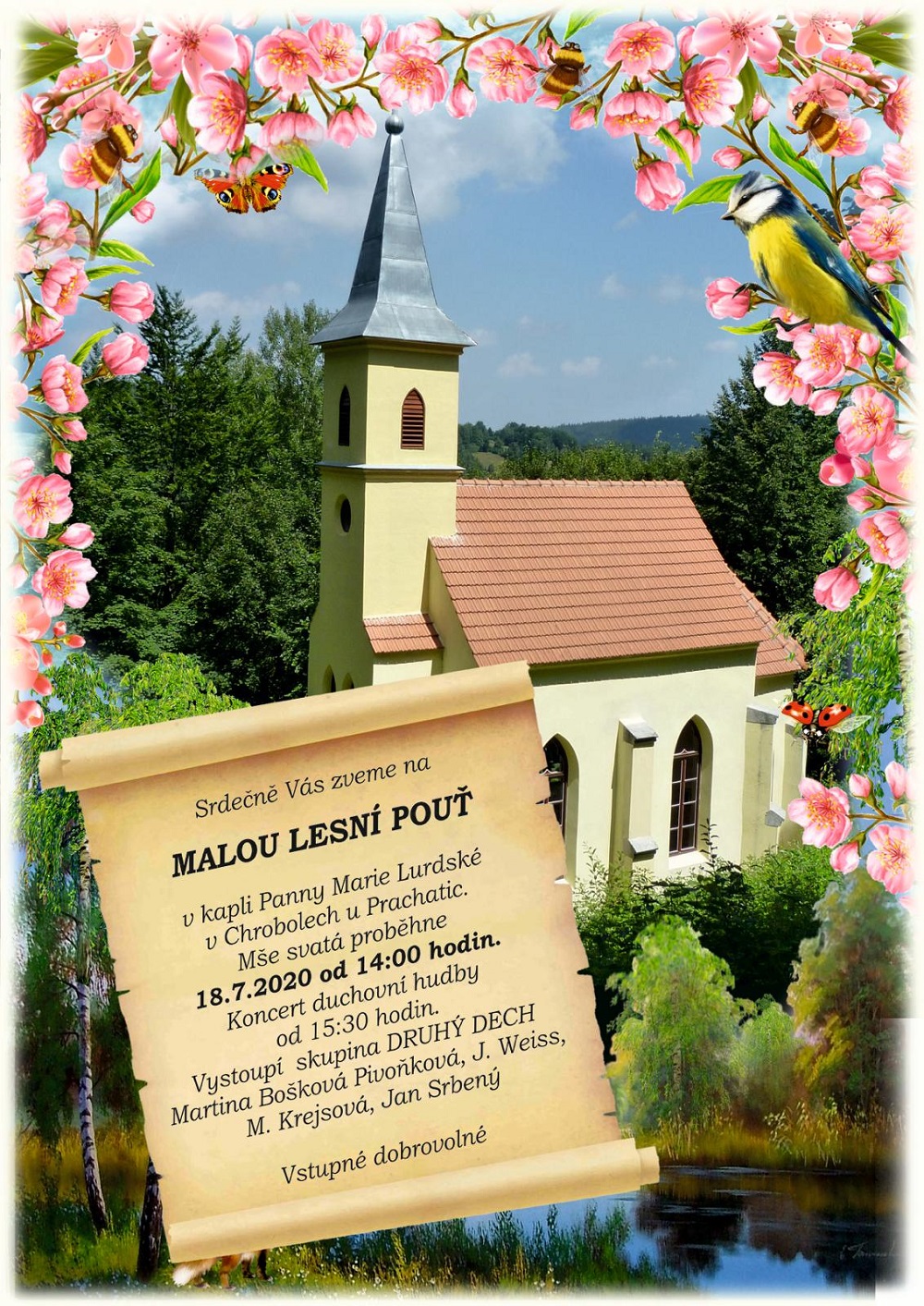 Srdečně Vás zveme na MALOU LESNÍ POUŤ. Mše svatá od 14:00 hodin, koncert duchovní hudby od 15:30 hodin. Vystoupí skupina Druhý dech: M. Bošková Pivoňková, J. Weiss, M. Krejsová, J. Srbený. Vstupné dobrovolné.