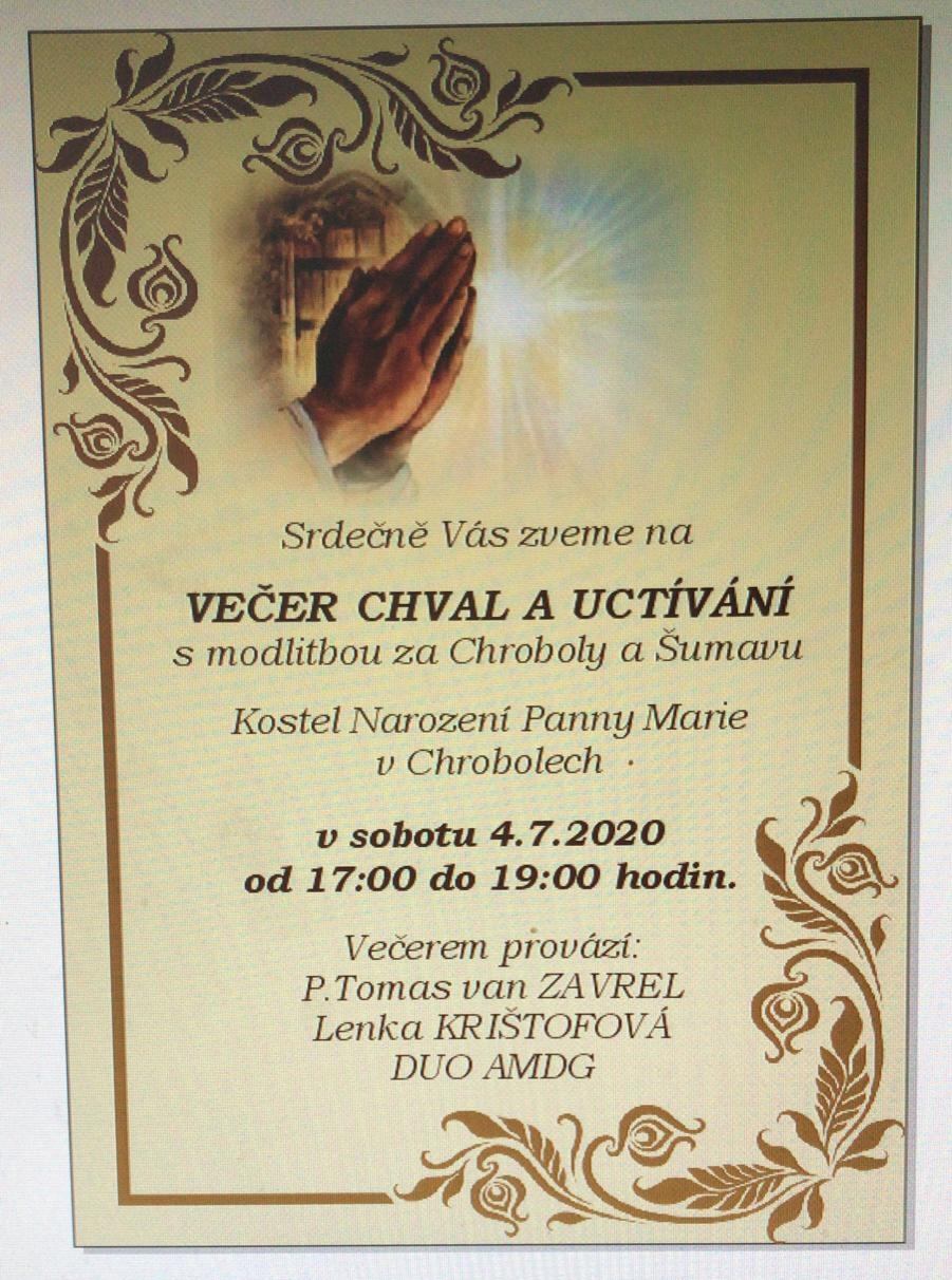 Srdečně Vás zveme na VEČER CHVAL A UCTÍVÁNÍ s modlitbou za Chroboly a Šumavu. Večerem provázejí P. Tomas van Zavrel, Lenka Krištofová a Duo AMGD.