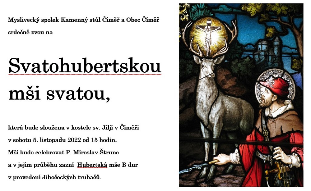 Mši svatou bude celebrovat P. Miroslav Štrunc a v jejím průběhu zazní Hubertská mše B dur v provedení Jihočeských trubačů.