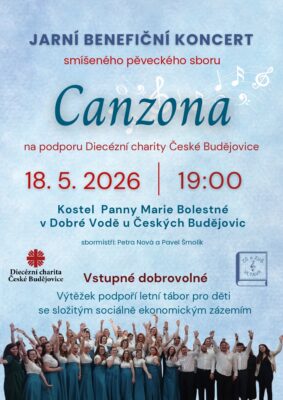 Benefiční koncert smíšeného pěveckého sboru Canzona na podporu letního tábora Diecézní charity pro děti ze znevýhodněného prostředí. Vstupné dobrovolné – hotovostí či QR kódem na místě.