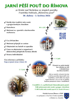 Vydejte se s námi na pěší pouť po tradiční poutní stezce ze Stráže nad Nežárkou do Římova po stopách povídky Františka Hobizala „Růženčina pouť“ při příležitosti jarní Římovské pouti. Pouť bude zahájena mší svatou ve čtvrtek 30. dubna v 11:30 v kostele ve Stráži nad Nežárkou a završena slavností mší svatou v Římově v neděli 3. května. Každý den bude na programu mše svatá (později zveřejníme přesný rozpis), katecheze, modlitba růžence aj. a také možnost sv. zpovědi či duchovního rozhovoru. Putovat budeme převážně nenáročným terénem Třeboňska, každý den asi 20 km. Spíše lze tedy doporučit lehčí obuv.