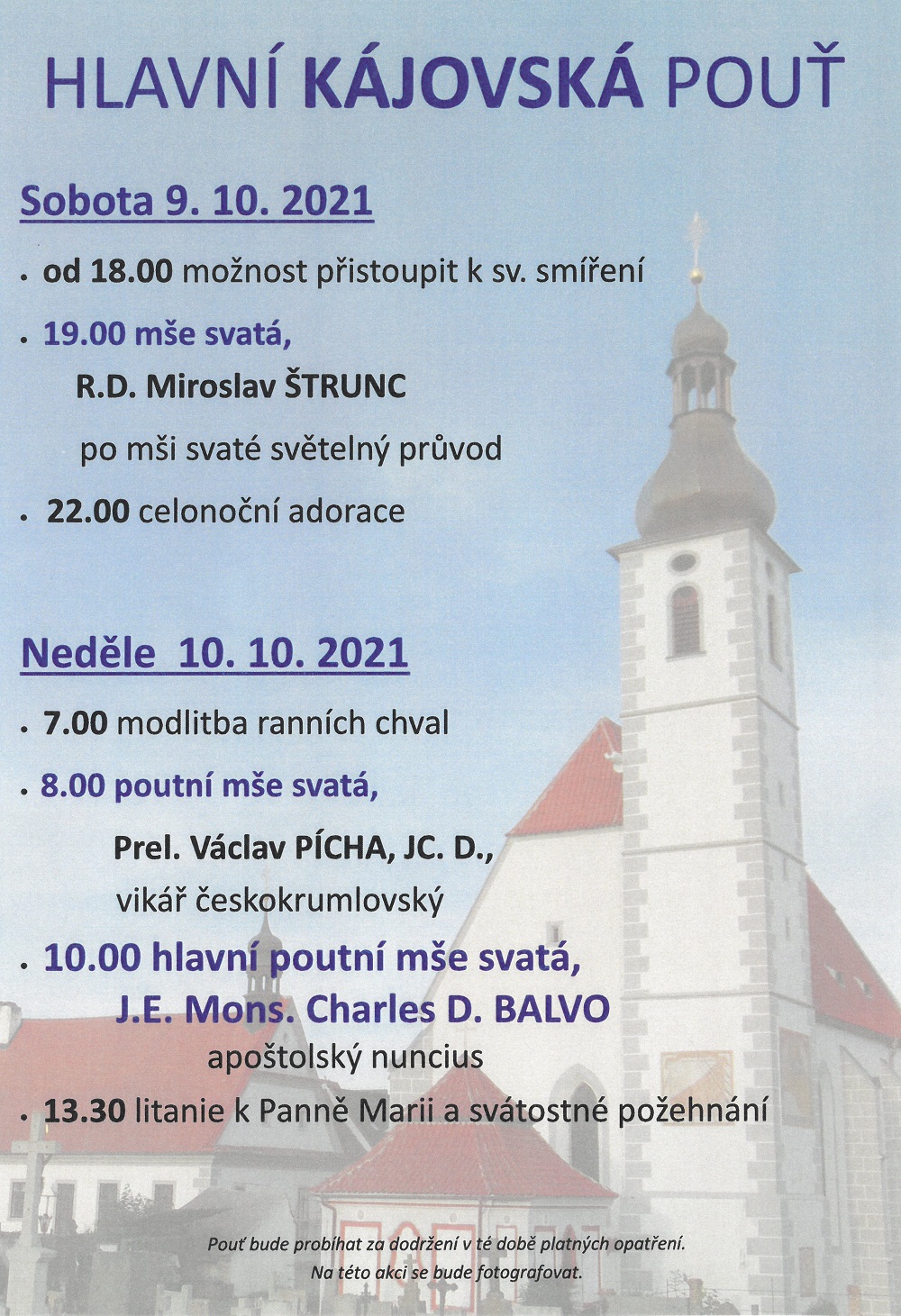 Zveme Vás do Kájova na letošní hlavní pouť. Nedávno byla dokončena celková oprava celého kájovského areálu, který teď, po několika letech usilovné práce řemeslníků a restaurátorů, získal svou původní krásu. Dvoudenní program bude probíhat podle v té době platných protiepidemických opatření.