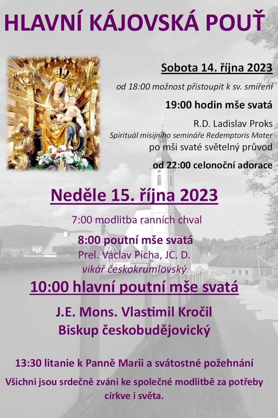 Jako každý rok i letos začne v Kájově v kostele Nanebevzetí Panny Marie hlavní pouť v podvečer 2. soboty v říjnu (letos 14. 10. 2023). Těšíme se na společnou modlitbu, večerní světelný průvod, celonoční adoraci i slavnostní promluvy celebrantů.