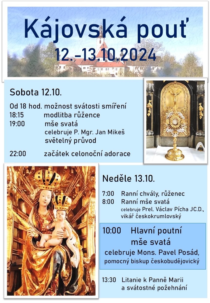 Připraven je bohatý dvoudenní program. Hlavní poutní mši svatou bude celebrovat Mons. Pavel Posád, pomocný biskup českobudějovický.
