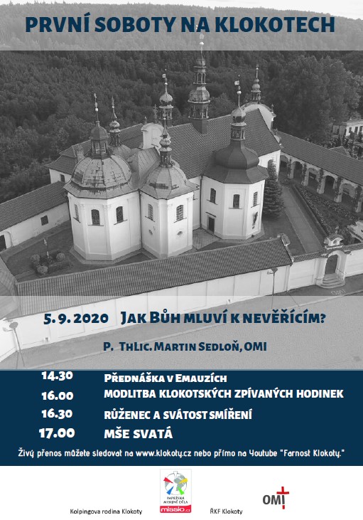 První soboty na Klokotech budou pokračovat během celého léta. V sobotu 5. září se bude P. ThLic. Martin Sedloň, OMI zabývat otázkou „Jak Bůh mluví k nevěřícím?“ (začátek ve 14:30). Živý přenos můžete sledovat na www.klokoty.cz nebo přímo na YouTube „Farnost Klokoty“.