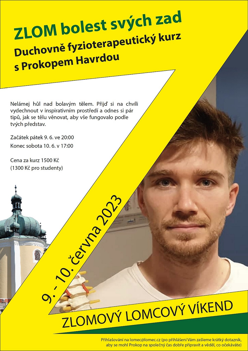 Duchovně fyzioterapeutický kurz s Prokopem Havrdou. Přihlašování na lomec@lomec.cz. Po přihlášení Vám zašleme krátký dotazník, aby se mohl Prokop na společný čas dobře připravit a věděl, co očekáváte.