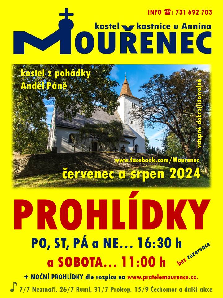 Již 1. července začaly v kostele na Mouřenci pravidelné komentované prohlídky. Podobně jako v minulých letech budou po celý červenec a srpen vždy v pondělí, ve středu, v pátek a v neděli od 16:30 h a lidé můžou přijít na prohlídku i v sobotu v 11 h tak, jak to platí po celý rok.