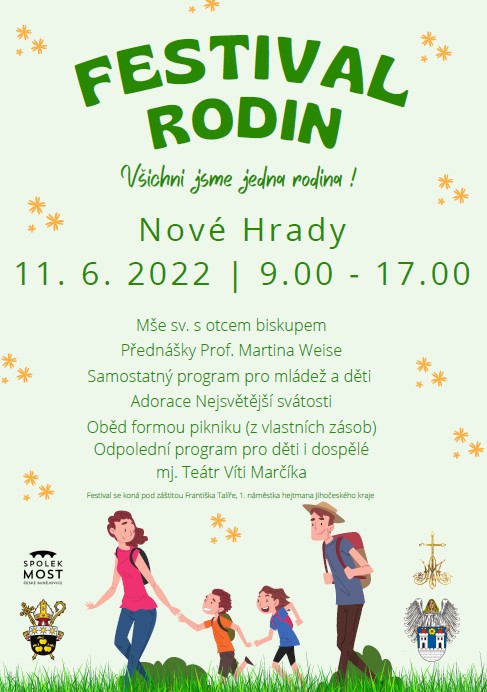 Pastorační středisko Biskupství českobudějovického vás srdečně zve na „Festival Rodin: Všichni jsme jedna rodina“ do Nových Hradů k zakončení Roku rodiny. Sejdeme se v sobotu 11. června v 9:00 v Nových Hradech, kde v kostele sv. Petra a Pavla bude slavena mše sv. s otcem biskupem. Pak následuje program pro děti, mládež i dospělé. Oběd bude formou pikniku (z vlastních zásob). Poté bude následovat představení Divadla Víti Marčíka a spousta her a zábavy pro celou rodinu, které zajišťuje město Nové Hrady. Nebude chybět ani koncert. Těšíme se na vás! Další informace na webu Prolidi.online.
