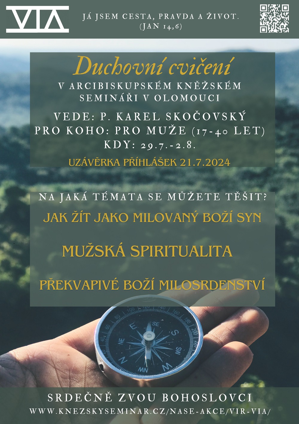 Duchovní cvičení určené pro mladé muže od 17 do 40 let, zaměřené na rozlišování povolání, se uskuteční 29. 7. – 2. 8. 2024 v Arcibiskupském kněžském semináři v Olomouci. Duchovní cvičení povede P. Karel Skočovský, prefekt studentů na kolejích AKS. Informace a přihlašování je možné na odkazu ZDE.