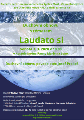 Diecézní centrum pro katechezi ve spolupráci se Spolkem Most – České Budějovice zve absolventy kurzu Akla a všechny další zájemce na duchovní obnovu na Lomec 7. března 2020. Duchovní obnovu se zaměřením na encykliku papeže Františka Laudato si povede otec Josef Prokeš. Projekt Nulový hlad představí Martina Fürstová.