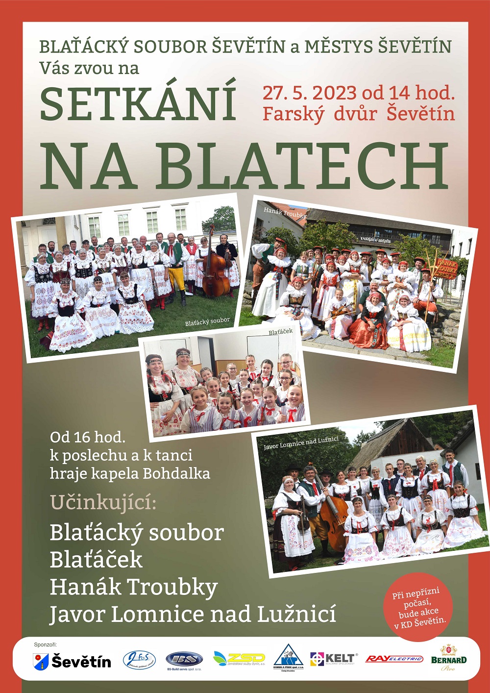 Účinkují: Blaťácký soubor Ševětín, Blaťáček, Hanák Troubky, Javor Lomnice nad Lužnicí. Od 16:00 hodin k poslechu a k tanci hraje kapela Bohdalka.
