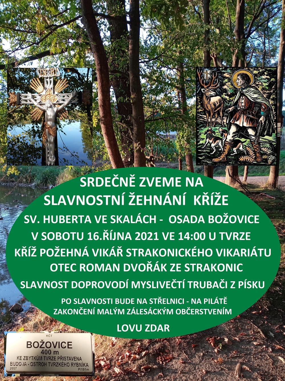 Kříž požehná otec Roman Dvořák. Slavnost doprovodí myslivečtí trubači z Písku. Po obřadu bude slavnost zakončena na střelnici „Na Pilátu“ malým zálesáckým občerstvením.