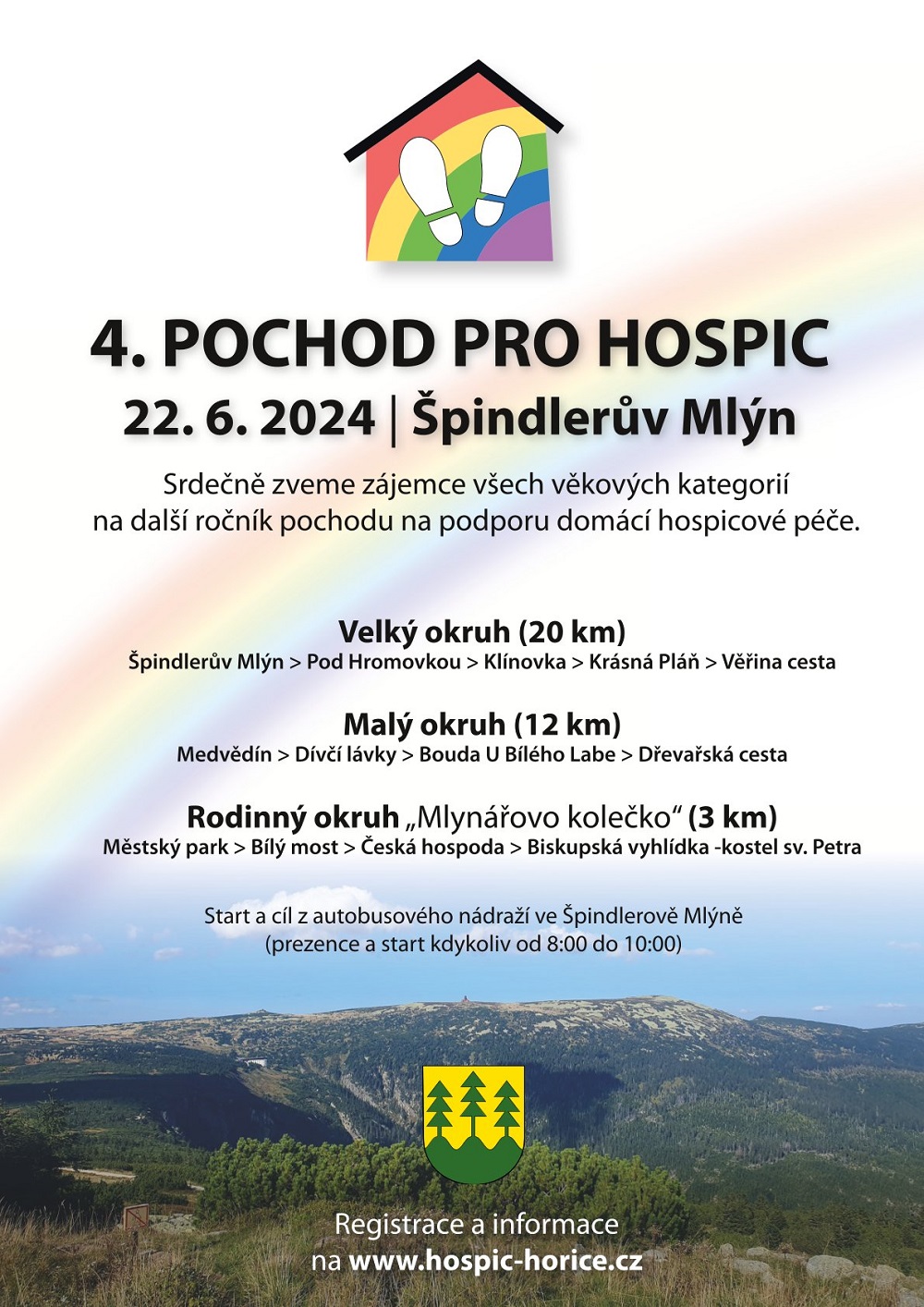 Domácí hospic Duha, o. p. s. v Hořicích pořádá 4. ročník Pochodu pro hospic. Jeho cílem je podpořit služby domácí hospicové péče a současně ukázat účastníkům některé krásy Krkonoš. Připraveny jsou tři okruhy pro všechny věkové kategorie v krásném prostředí Krkonoš.